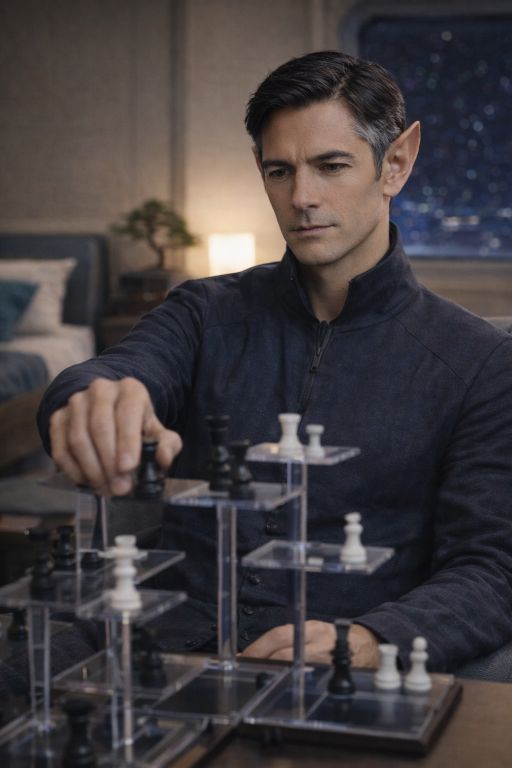 | Physical Description | Tavrek Harland stands just over six feet tall, lean and long-lined, his strength contained and measured rather than built for bulk. He moves with quiet precision, inhabiting space with deliberate economy, conveying discipline without austerity. His face is long and refined, shaped by Vulcan symmetry softened by Human variance. High cheekbones and a narrow jaw give definition without severity, and his features read as composed and intentional. His ears carry a subtle Vulcan point, restrained rather than pronounced. His eyes are pale grey-green, deep-set and observant, often seeming to weigh intent more than words. At rest, his expression tends toward seriousness, not coldness but controlled composure. His hair is dark, worn in a practical Human cut with natural wave, with grey beginning to show at the temples. He leaves it visible without comment, the grey lending quiet gravitas. |
