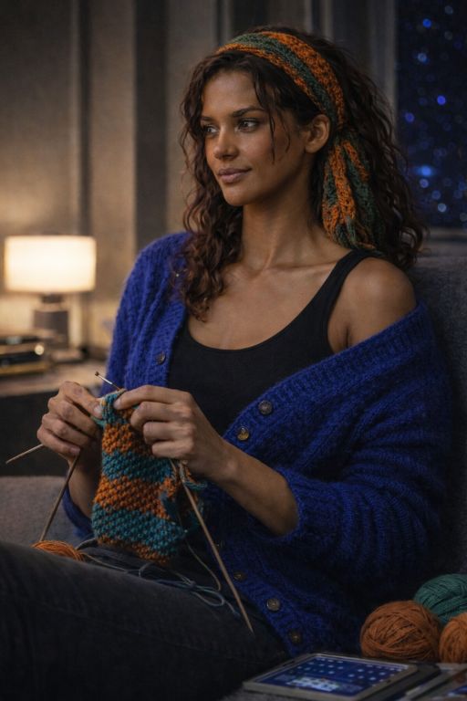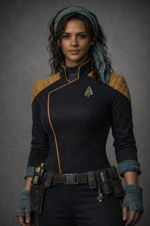| Physical Description | Elen Rell has a strong, agile build: not bulky, but defined by the balance and physicality of someone who moves constantly, fixes things by feel, and rarely sits still unless she’s deep in thought or mid-poem. Her skin is a smooth coppery brown, and her expressive hazel eyes shift from green to gold to honey depending on the light or her mood. Despite her Betazoid blood, her eyes have retained the same colour as her father’s eyes. Her hair is a crown of dense coils and waves, often pulled back in a loose puff or wrapped in a patterned headscarf: frequently one of her own designs. Elen wears her uniform like she was born in it but always personalises it: a knit cuff at the wrist, a slightly asymmetric tuck, a handmade charm hidden on her belt loop. Her hands are always moving, from fiddling with tools, twirling a crochet hook, or tracing lines in the air when deep in technical thought. She speaks with a warm Martian lilt and an easy laugh that can defuse tension or equally mask her unease. |